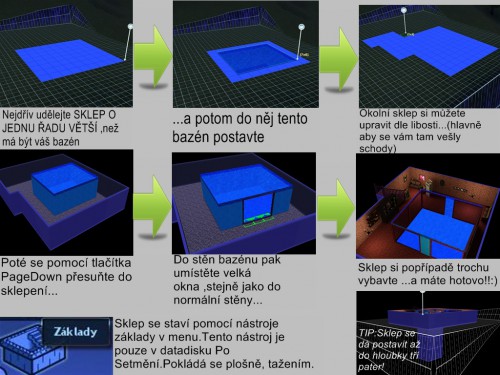 První návod se týká stavění bazénu ve sklepě tak ,aby do něj navíc i bylo vidět.K provedení této stavby potřebujete aktualizovanou hru The Sims 3 a dodatek Po Setmění.