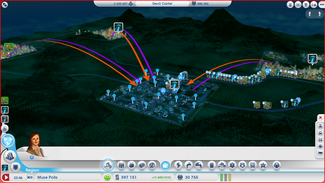 Co dál? Inu, zde přichází ke slovu idea SimCity.Vzájemně prospěšná simbióza měst! Zaberte nové město a sem přesuňte všechnu tu nepříliš vonící a nablýskanou vrstvu služeb.V novém městě nechejte bydlet pouze nejnižší vrstvu obyvatelstva a nabídněte jim manuální práci. Energii, vodu a dokonce i služby policie můžete s druhým městem sdílet, to vám pomoc oplatí třeba pracovními silami, místy k nakupování a školstvím. Pokud se vám podaří spolupráci takto vybalancovat, můžete si zatleskat.